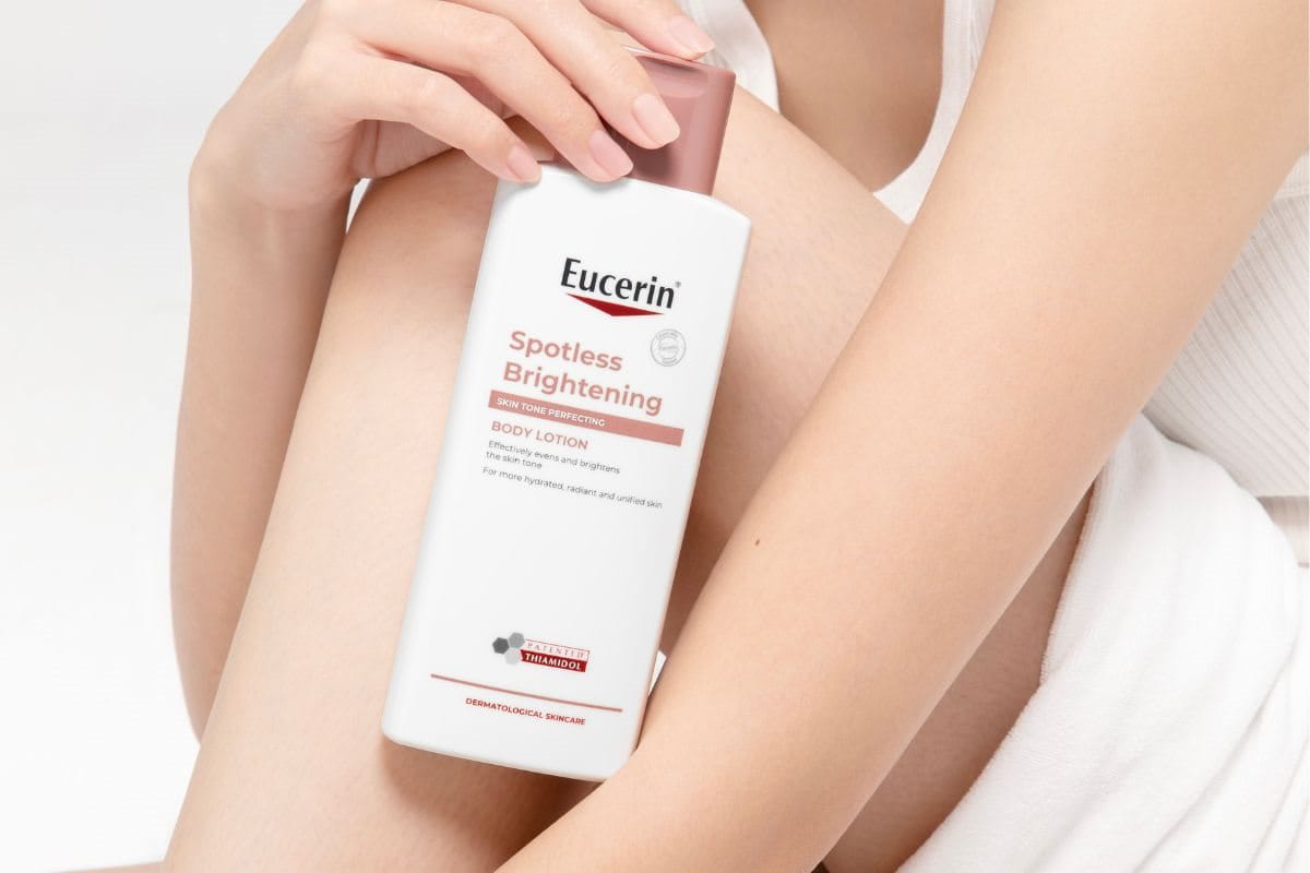 ยูเซอรินขอแนะนำครีมบำรุงผิวกายเพื่อผิวขาวกระจ่างใสหลังจากขัดขี้ไคล Eucerin SPOTLESS BRIGHTENING SKIN TONE PERFECTING BODY LOTION ครีมทาผิวกายที่ช่วยลดปัญหาผิวหมองคล้ำ ช่วยให้ผิวกระจ่างใส ไม่ว่าจะจุดด่างดำ สีผิวที่ไม่เท่ากัน ด้วยสารพลังของ Thiamidol ช่วยปรับสีผิวให้กระจ่างใสขึ้น และด้วยคุณสมบัติพิเศษที่ลดการทำงานของเมลานินได้ลึกถึงต้นตอ ทำให้ช่วยการลดจุดด่างดำบนผิวได้อย่างดีเยี่ยม มาพร้อมกับ Hyaluronic Acid ที่บางเบา ช่วยเติมความชุ่มชื้นให้ผิวและรักษาความชุ่มชื้นได้ถึง 24 ชั่วโมง เพื่อผิวที่เนียนนุ่ม เสริมพลังด้วย Licochalcone A ป้องกันการระคายเคืองและอาการแพ้ต่างๆอีกด้วย เนื้อครีมบางเบา ซึมง่าย ไม่เหนอะหนะผิว