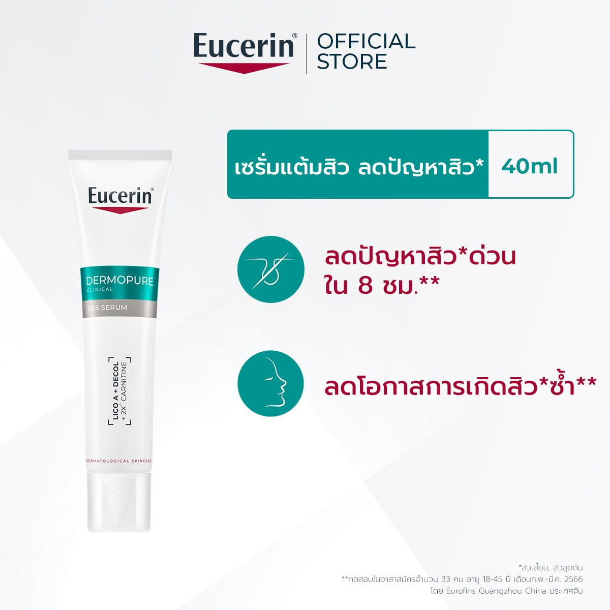 CLINICALLY TESTED FORMULA ผลิตภัณฑ์เซรั่มสำหรับผิวมันเป็นสิวผสานส่วนผสมของ: • 3X Anti-acne Technology ที่มี Lico A, Decol และ 2X Carnitine ช่วยลดปัญหาสิว และคุมความมันได้อย่างมีประสิทธิภาพ • 3X Acid compounds AHA, PHA และ BHA จัดการสิวอุดตัน และช่วยลดโอกาสการเกิดสิวใหม่ • Panthenol ปลอบประโลมและฟื้นบำรุงผิวโดยไม่ทำให้ผิวแห้งตึง ผ่านการทดสอบทางคลินิกแล้วว่าช่วยลดปัญหาสิว และลดโอกาสการเกิดสิวใหม่ คุมความมัน 8 ชม. เริ่มลดปัญหาสิว ตั้งแต่วันแรกที่ใช้ ไม่ก่อให้เกิดสิวไม่ก่อให้เกิดการอุดตัน